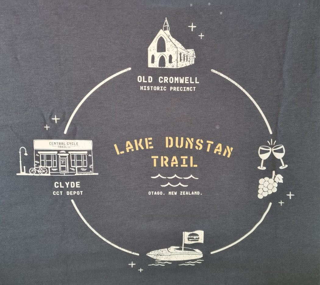 Our epic Lake Dunstan tee with a badge on the front and trail icons on the back.